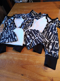 Fick en massa enfärgade tyger att använda som komplettering till en massa mönstrade tyger. Lena packade även med 1,5 m av detta fina tyg med verktyg på som blev 3 baggydressen med tillhörande mössa.